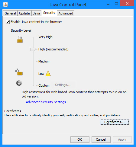 Ami pedig a webes biztonságot illeti, a felhasználók a Vezérlőpultból elérhető Java Control Panelen található "Security" fülön kikapcsolhatják a Java tartalmak böngészőkben való futtatását, amennyiben arra nincs szükségük. A szakember hangsúlyozta, hogy az itt található biztonsági beállítások alapértelmezés szerint "magas" szintre vannak állítva, aminek köszönhetően a nem megfelelően aláírt vagy önaláírt Java appletek automatikus futtatása megakadályozható. Ezzel pedig csökkenthetők a kockázatok.