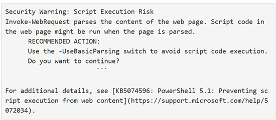 A KB5074204 számú frissítés telepítését követően a PowerShell azon scriptek futtatása előtt egy jóváhagyásra fog várakozni, amelyek tartalmaznak Invoke-WebRequest parancsot. Ekkor a következő jelenik meg:
