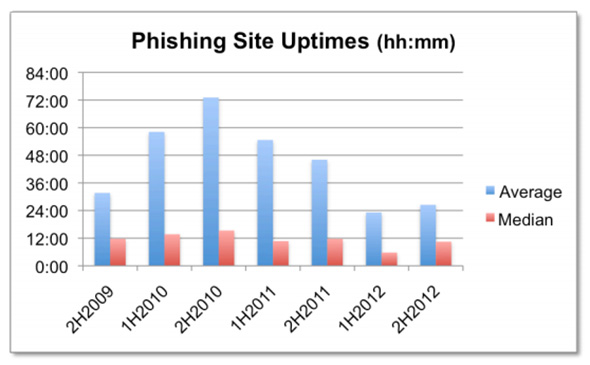 Az adathalászok mindig is igyekeztek leplezni a jelenlétüket, és kijátszani a védelmi technológiákat. Az egyik módszerük, hogy az adatlopási célokkal létrehozott weboldalaikat gyakran költöztetik a domainek között. Erre azért van szükségük, mert a feketelistákra épülő biztonsági eszközök így kevésbé tudják megakadályozni őket a céljaik elérésében. Ugyanakkor azt is mérlegelniük kell, hogy minél rövidebb ideig folytatnak egy akciót, annál kevesebb felhasználót tudnak elérni. Az APWG azt is megvizsgálta, hogy ez számokban kifejezve pontosan mit is jelent. Kiderült, hogy 2012 második félévében egy-egy adathalász támadás átlagosan 26 órán keresztül tartott. Ez az érték a magyarországi támadások tekintetében 37 órára adódott.