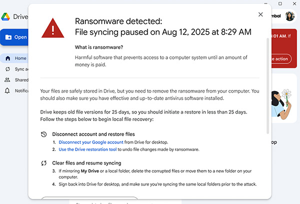 A Google bejelentette, hogy a Drive-hoz egy olyan technológiát fejlesztett ki, amely mesterséges intelligencia alapú eljárásokkal detektálja a ransomware támadásokat, és egy ilyen incidens esetén azonnal szünetelteti a Google Drive számítógépekre kifejlesztett (desktop) változataiban a szinkronizálást. Ezzel óvja meg a felhőben lévő, sértetlen állományokat a szélesebb körű károkozásoktól.